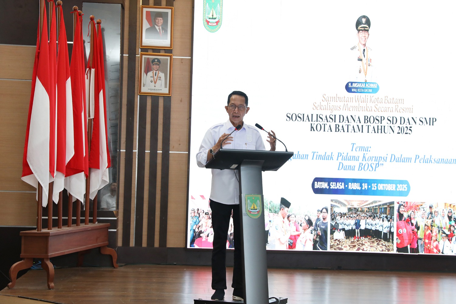 Wali Kota Batam, Amsakar Achmad, secara resmi membuka kegiatan Sosialisasi Dana Bantuan Operasional Satuan Pendidikan (BOSP) SD dan SMP Kota Batam Tahun 2025, yang digelar di Kantor Wali Kota Batam, Rabu (15/10/2025). Kegiatan ini mengusung tema “Pencegahan Tindak Pidana Korupsi dalam Pelaksanaan Dana BOSP” dan dihadiri oleh para kepala sekolah serta pengelola dana pendidikan di lingkungan Pemerintah Kota Batam.
