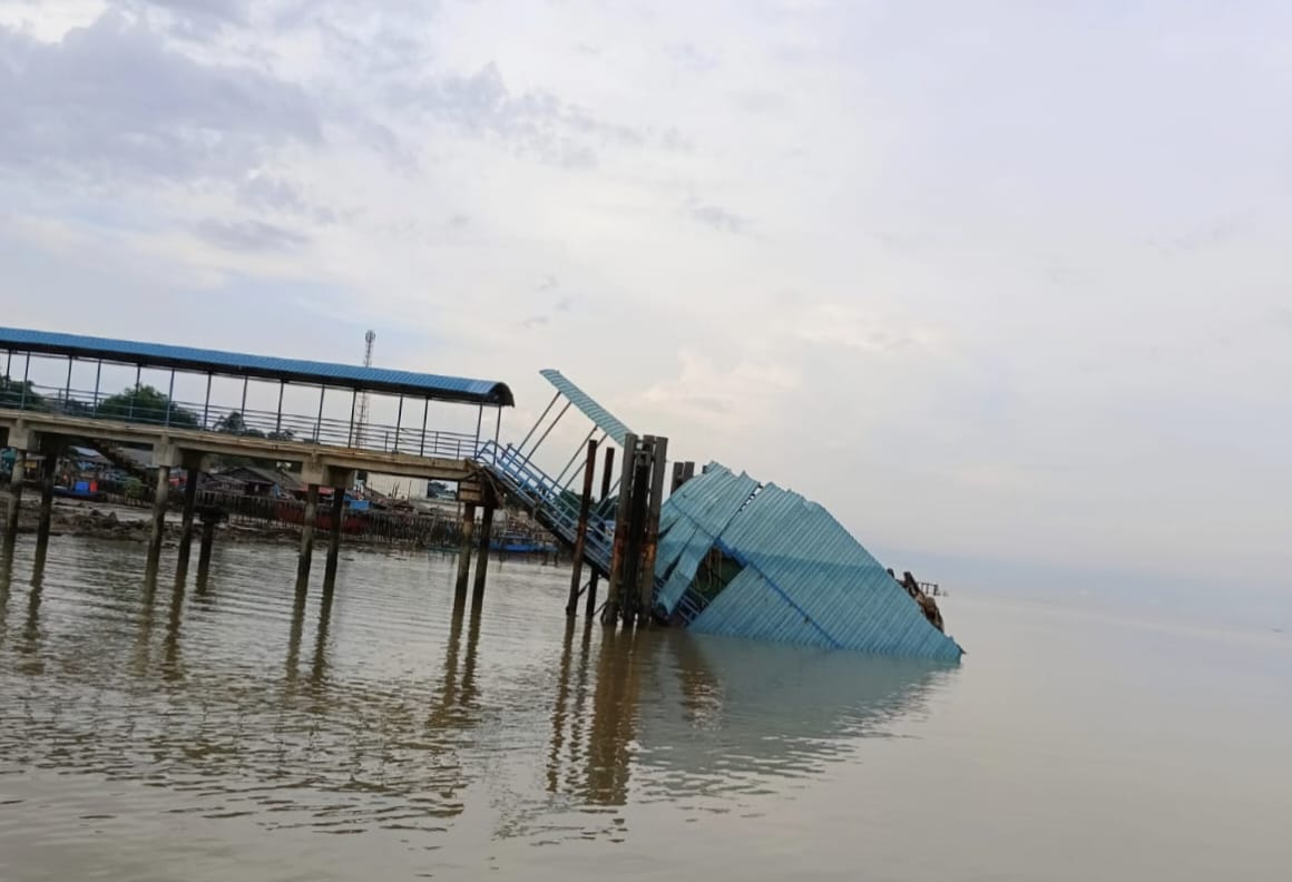 Diduga ambruknya ponton kedatangan pelabuhan penumpang antar pulau tersebut disebabkan oleh hempasan ombak laut.